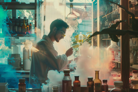 Scientist in lab coat with colorful chemical flasks, experimental research and innovation
