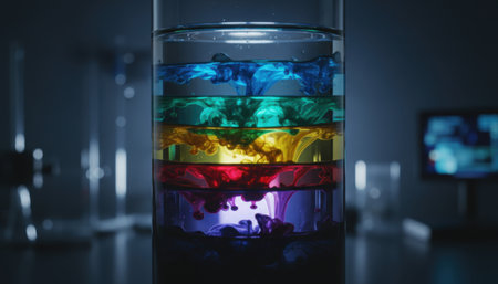 Vibrant liquid layers in a glass beaker showcasing density science experiment, perfect for educational or artistic visualizations.