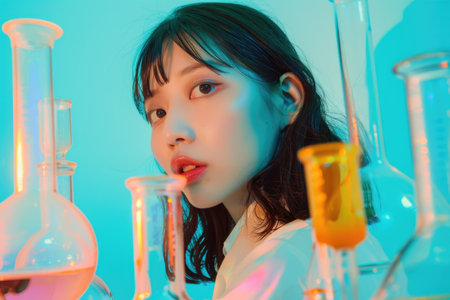 A young woman with dark hair leans into a group of beakers and flasks. The blue light casts a cool and slightly surreal glow on the scene.