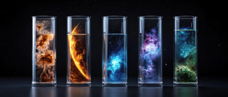A series of five glass containers, each filled with a different color of liquid, with a black background