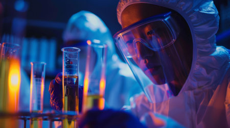 Female doctor in the laboratory performs chemical tests with ampules in a protected environment