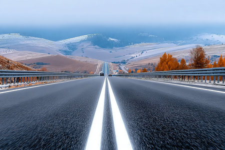 The long stretch of highway seems to disappear into the horizon creating an endless road that beckons to adventurous drivers. . AI generation