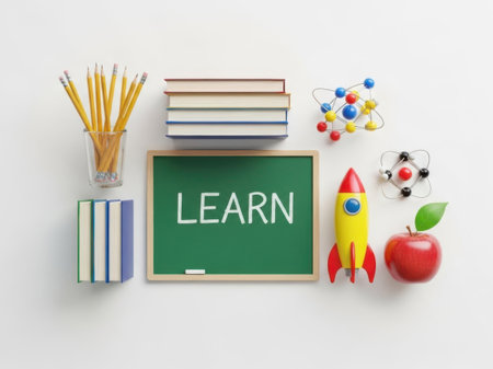 A chalkboard with the word 'LEARN' written on it, surrounded by various educational items including pencils, books, a molecular model, a rocket ship, an apple, and a pair of glasses.