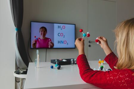 Kid learning remotely. Girl making experiments during online chemistry lesson at home
