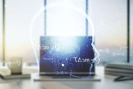 Desktop computer background and formula hologram writing. Double exposure. Education concept.