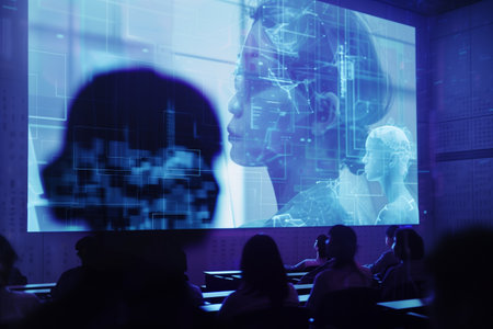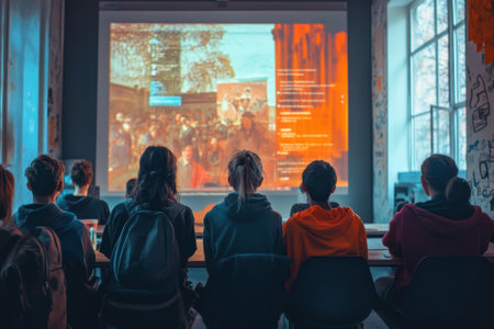 Students attentively watch a presentation on a large screen during a virtual learning session in a classroom.