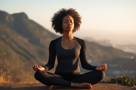 Concentration and meditation Top view of beautiful young African woman in sportswear practicing yoga while sitting in lotus position on the floor : Generative AI
