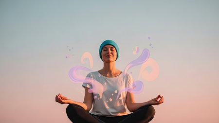 A woman sits outdoors in a meditative pose with eyes closed, embodying tranquility. The composition features soft lighting with a gradient sky and diffused elements. Colors include pastels and blues, suggesting a serene atmosphere. This image could be suitable for health, wellness, and lifestyle content.
