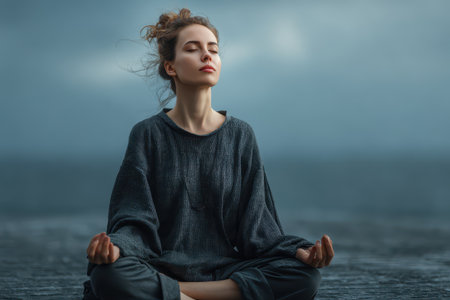 Meditating young woman practices mindfulness on a serene coastline during overcast weather, embracing tranquility and self-awareness in natures beauty