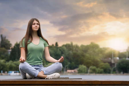 Young happy caucasian woman meditating alone in nature. Healthy lifestyle and relaxations. High quality photo