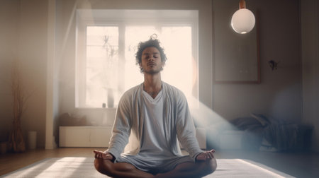 Generative AI : young black man doing yoga and sitting in lotus position at home in the bedroom