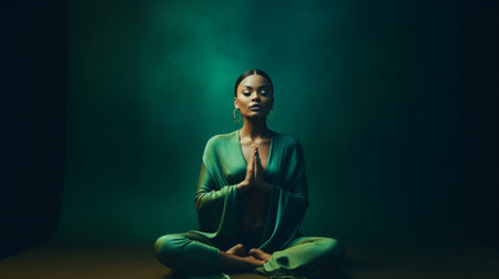 Calm relaxed dark skinned woman stands in lotus pose feels relieved tries to concentrate in peaceful atmosphere wears casual green clothes isolated on blue background Bod : Generative AI