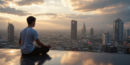 Serene Balance Amid Urban Chaos A reflective scene of a solitary meditator atop a high-rise overlooking a bustling city, symbolizing