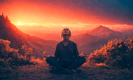 Tranquil meditation scene, individual amidst mountains at dusk, achieving mental balance, solitude in nature embrace, spiritual journey