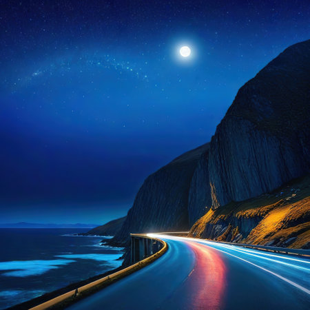 Against the sea at the foot of the mountains at night the road trailing car tail lights under a beautiful starry