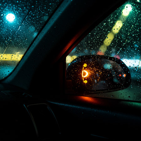 Rain drops on the car windshield at night, bokeh background