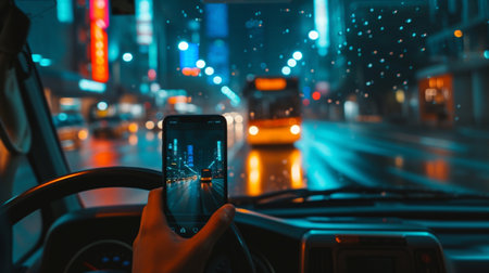 AI Generated. Nighttime city driving with vibrant lights and reflections on the windshield