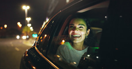 Happy, tablet and businesswoman in car at night in city with networking, email or communication. Smile, technology and female person checking project with deadline in vehicle with commute in town.