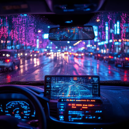 Driving through rainy city at night with futuristic dashboard displays and vibrant lights reflecting on the wet road.