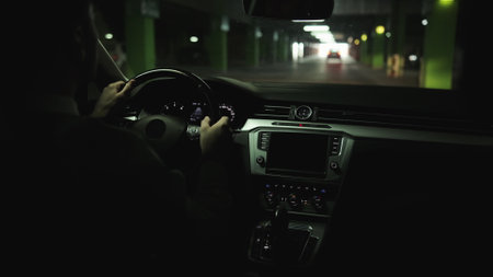 Man driving car on parking space, hands turning steering wheel. Adult man rides in modern car by underground parking. Man driving car through an underground parking lot looking for a place to park