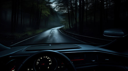 Winding road through dark forest at dawn, mysterious travel journey concept