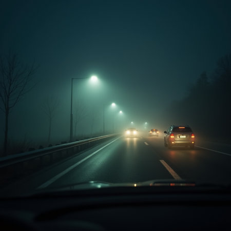 Car driving on a foggy road at night, motion blur.
