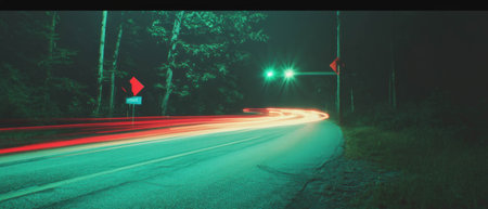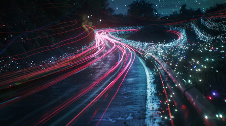Captivating Nighttime Long Exposure Photography on a Winding Road Featuring Light Trails