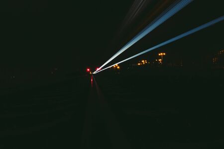 Light colorful train trails on rails at night. Traffic, travel long exposure photo