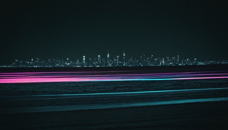 A stunning nighttime view of a bustling highway with vibrant light trails from moving vehicles, framed by a modern city skyline, showcasing urban life and energy.