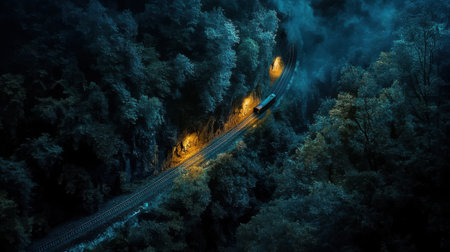 A train moves through a dense forest at night, surrounded by tall trees and a misty atmosphere. Soft lights illuminate the railway, creating a serene and magical ambiance.