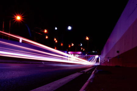 Captivating nighttime long exposure photograph capturing vibrant light trails from vehicles on a busy highway, illustrating dynamic motion and urban energy.