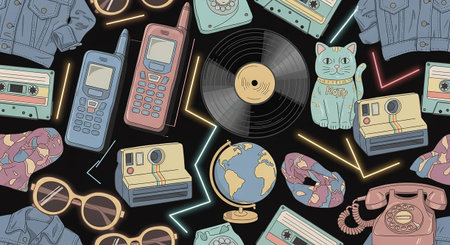 A busy collage of 1980s and 1990s pop culture and fashion is presented against a black background. The a mix of including cassette tapes, a vintage mobile phone, a vinyl record, sunglasses, a denim jacket, a stylized cat, a Polaroid camera, a globe, roller skates, and a rotary telephone. Many are outlined with neon lines in various colors, adding a vibrant and retro feel. The overall composition is a nostalgic and playful representation of the era's distinctive style and technology.