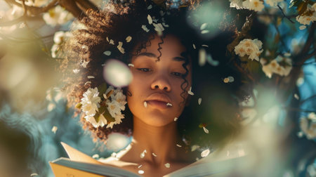 The picture of the woman is holding the book and focusing on reading book under the tree that has been surrounded with falling flowers in spring under the sunlight of the morning of bright day. AIG43.
