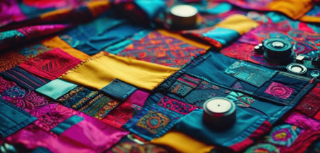 Colorful patchwork quilting with a candle and a camera