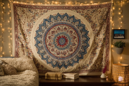 Vibrant mandala tapestry adorns wall, illuminated by soft fairy lights, enhancing the cozy ambiance of a stylish living area with plush textures and decorative elements