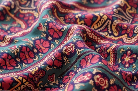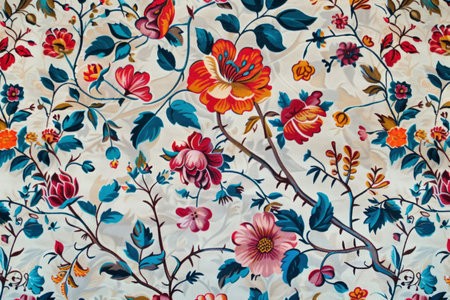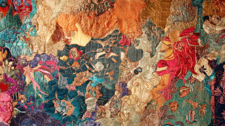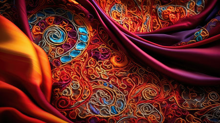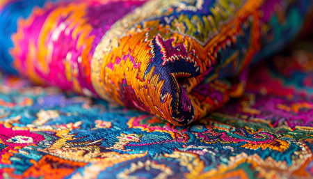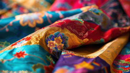 Vibrant multicolored fabric with ornate floral patterns and detailed textures. That the image is generated using AI.