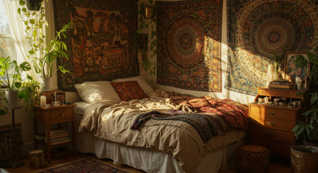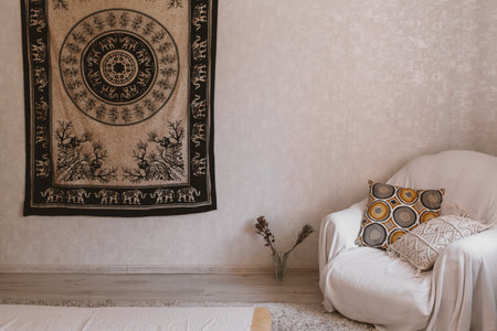 intricate mandala tapestry hanging on the wall of bohemian home, created with generative ai