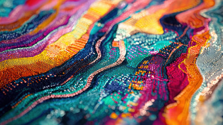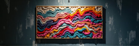 Colorful abstract textile art with vibrant wavy patterns on display. That the image is generated using AI.