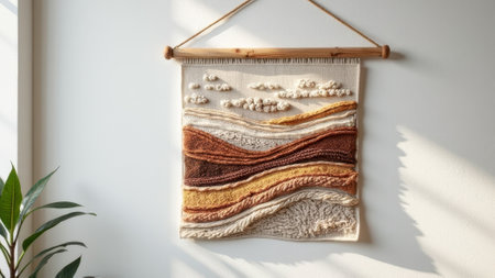 Handmade woven wall hanging with natural tones and abstract landscape design. That the image is generated using AI.