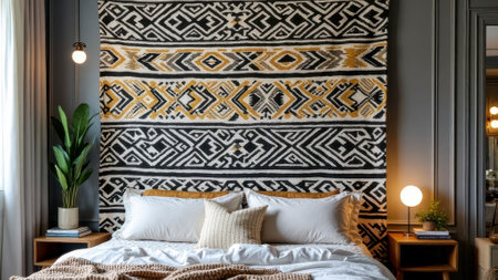 Cozy bedroom with geometric wall art and elegant decor. That the image is generated using AI.