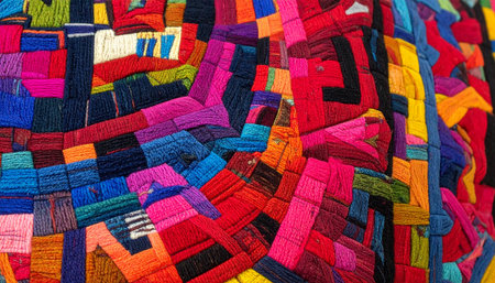 This image showcases a vibrant geometric textile pattern, featuring intricate stitching details and a rich color palette that exemplifies handmade artistry.