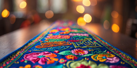 Colorful embroidered textile with floral patterns displayed in cozy indoor setting during evening