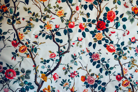 Vibrant floral pattern on colorful fabric with red and green motifs. That the image is generated using AI.