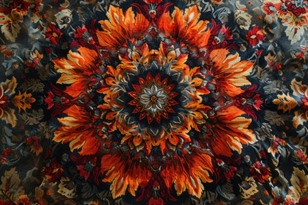 A close-up photograph of a rug with a circular floral design, showcasing the intricate details and vibrant colors of the textile.