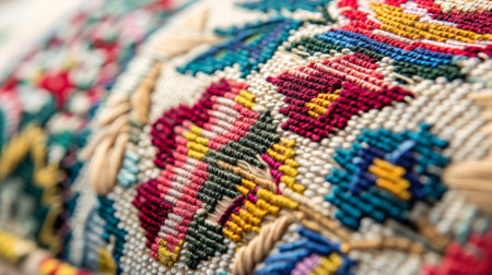 A vibrant explosion of color and texture, this detailed shot of a handmade textile showcases a rich tapestry of interwoven threads.