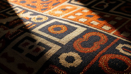 A detailed close-up of a richly textured fabric featuring a geometric pattern. Dark blue squares and circles are interspersed with orange and gold elements that have a subtle sparkle or glitter. A strong beam of light casts dramatic shadows across the woven surface, highlighting the intricate details and luxurious feel of the material.