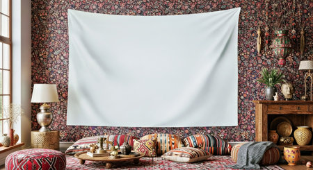 Eclectic Blank Wall Tapestry Mockup Vibrant Globally Inspired Den Interior