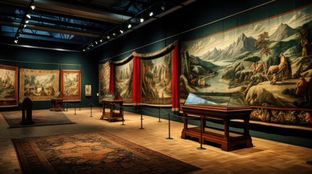 A magnificent and massive medieval tapestry depicting a detailed battle scene with knights on horseback is displayed in a modern museum gallery. The intricate textile art showcases history, warfare, and craftsmanship from the Middle Ages for public viewing.