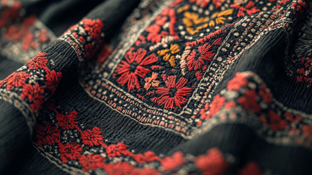 Intricate ukrainian vyshyvanka close up of vibrant red and black embroidery patterns on soft fabric