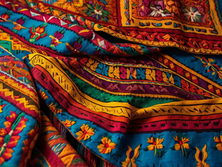 Explore the beauty of a vibrant traditional fabric featuring intricate patterns and rich colors. Perfect for art, fashion, and decor inspiration or showcasing craftsmanship.